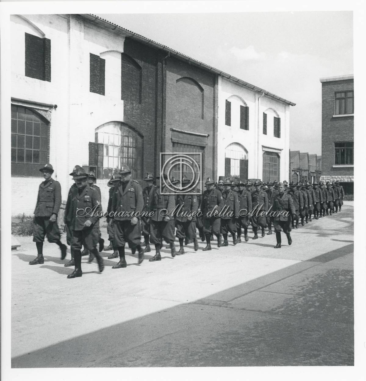 Gruppo di militari a protezione dello stabilimento in marcia