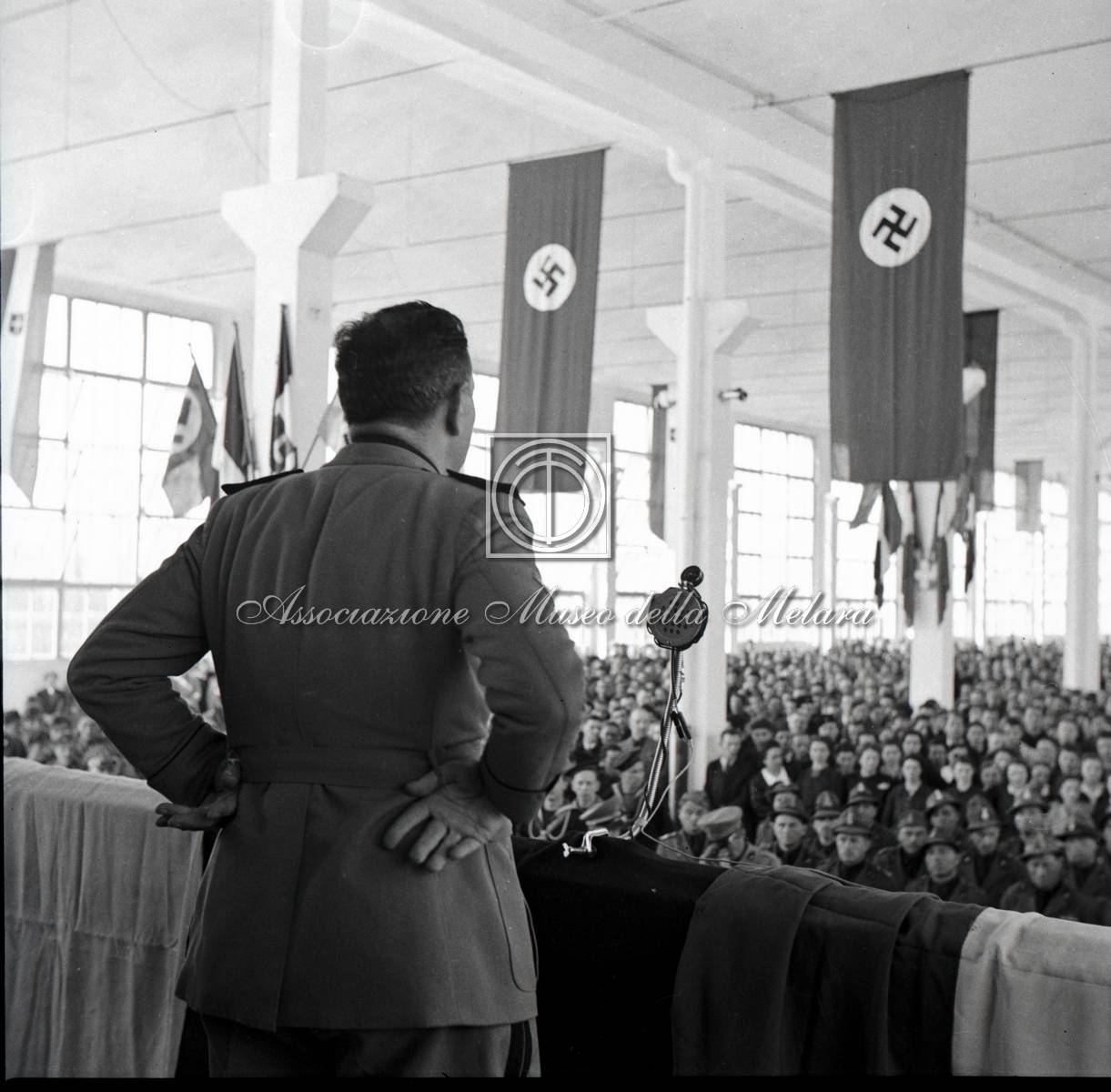 Gerarca di spalle mentre tiene il discorso al comizio fascista