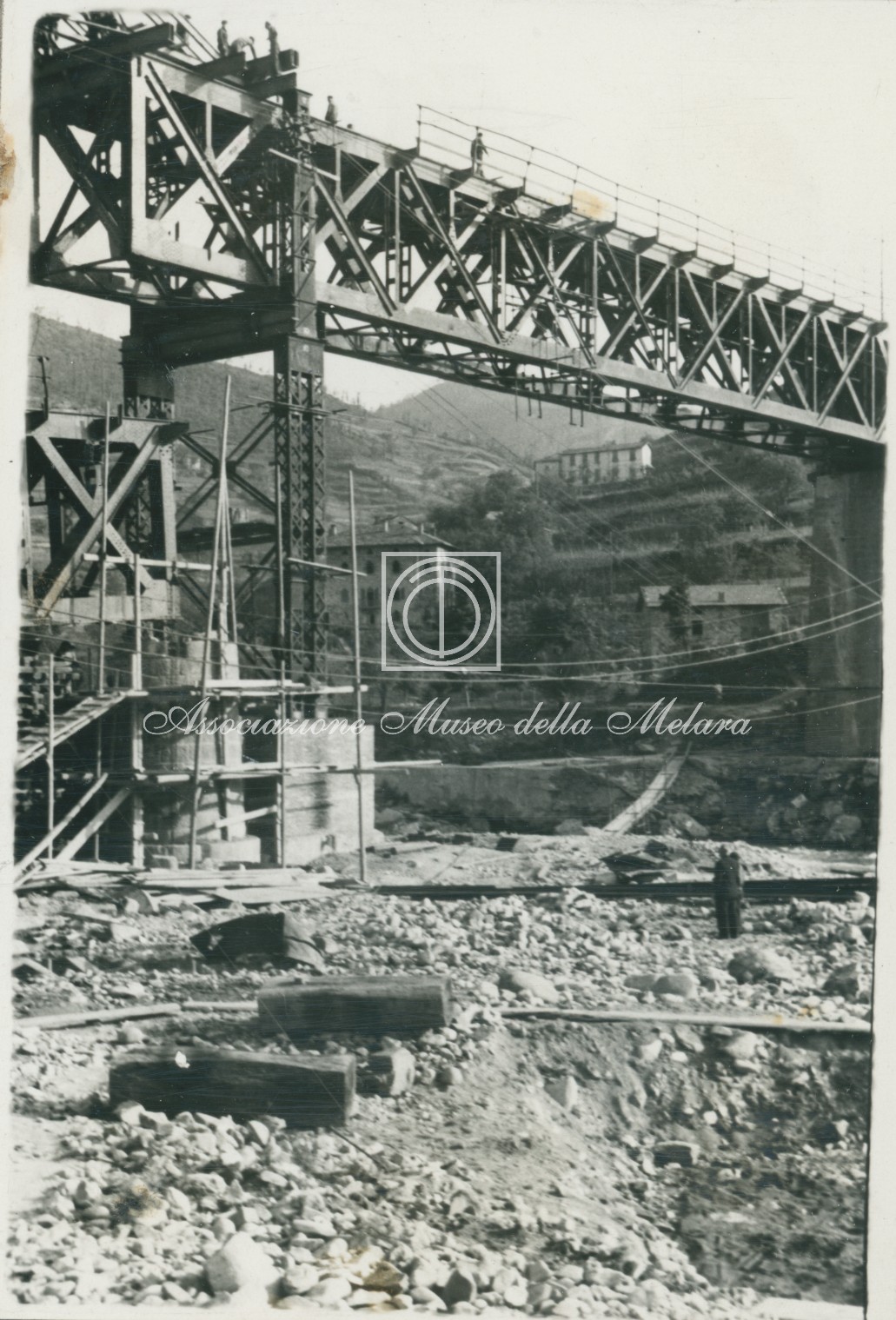 Parte di Pila e travata in riparazione con case sullo sfondo