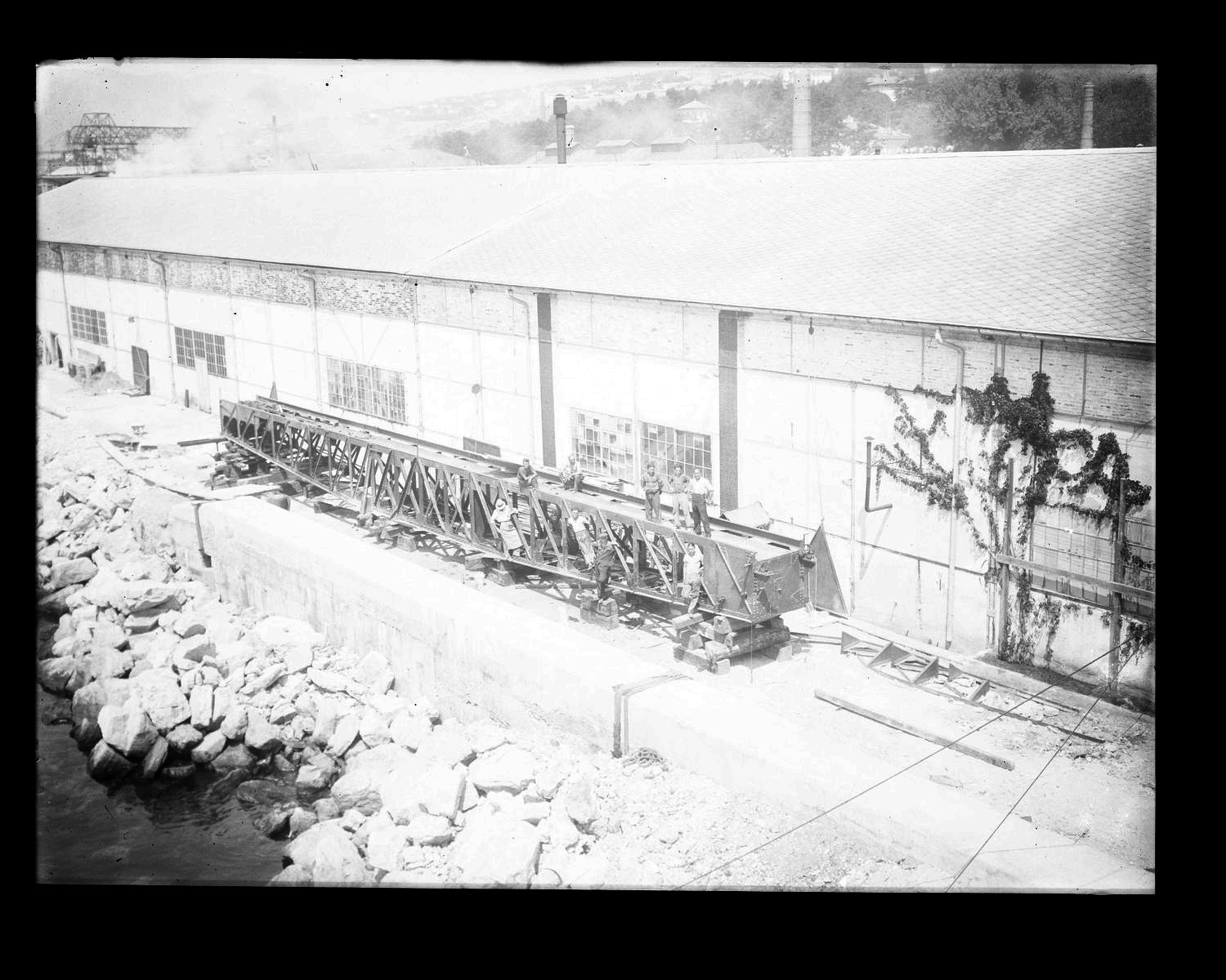 Operai sulla catapulta per aviosiluri del silurificio Whitehead di Fiume prima del montaggio