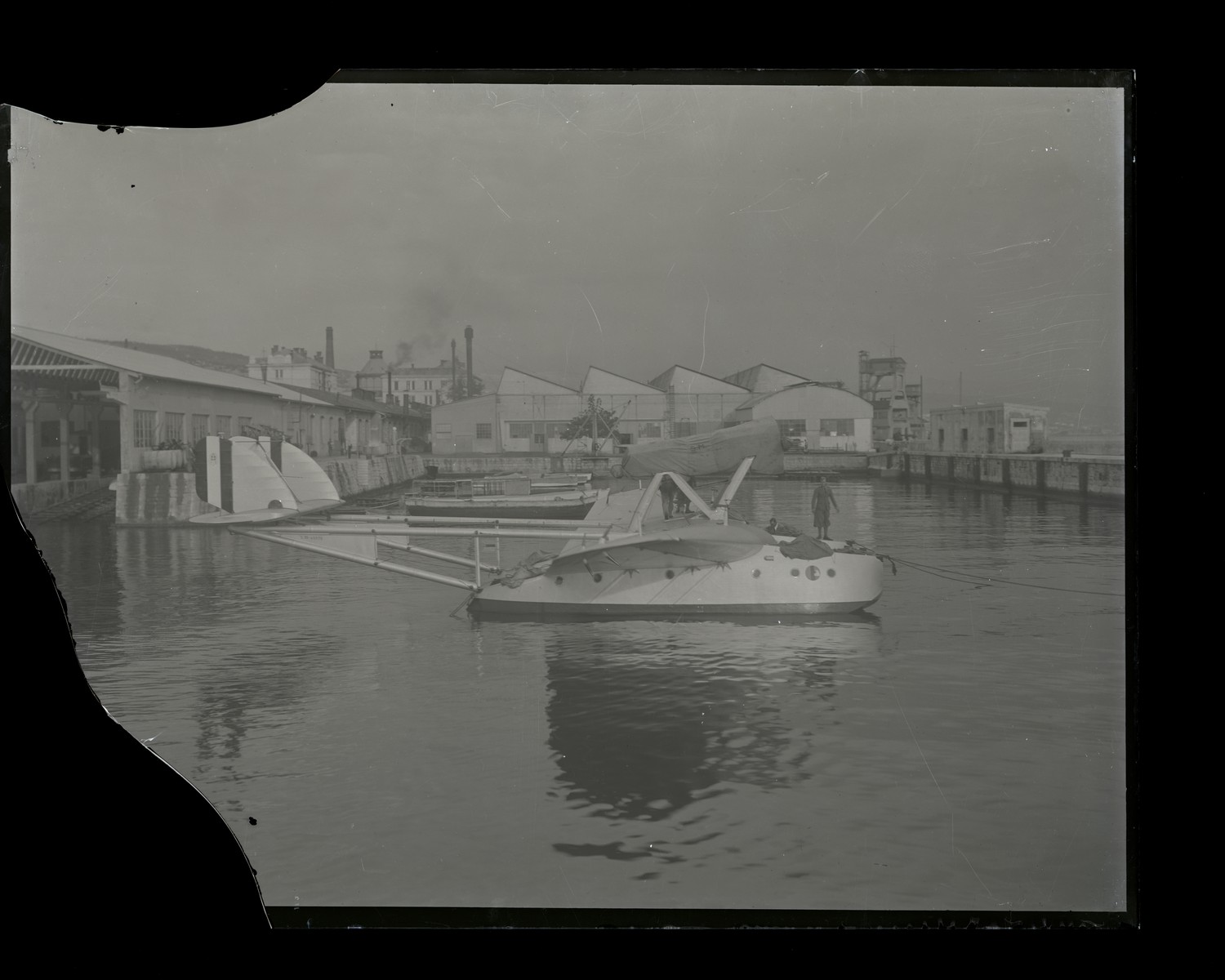Idrovolante in mare di fronte allo scalo per motoscafi del silurificio Whitehead di Fiume