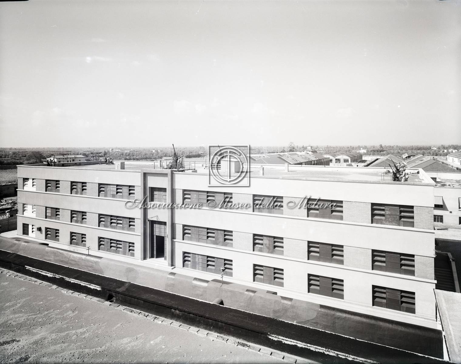Vista frontale della palazzina durante le prove di difesa contraerea